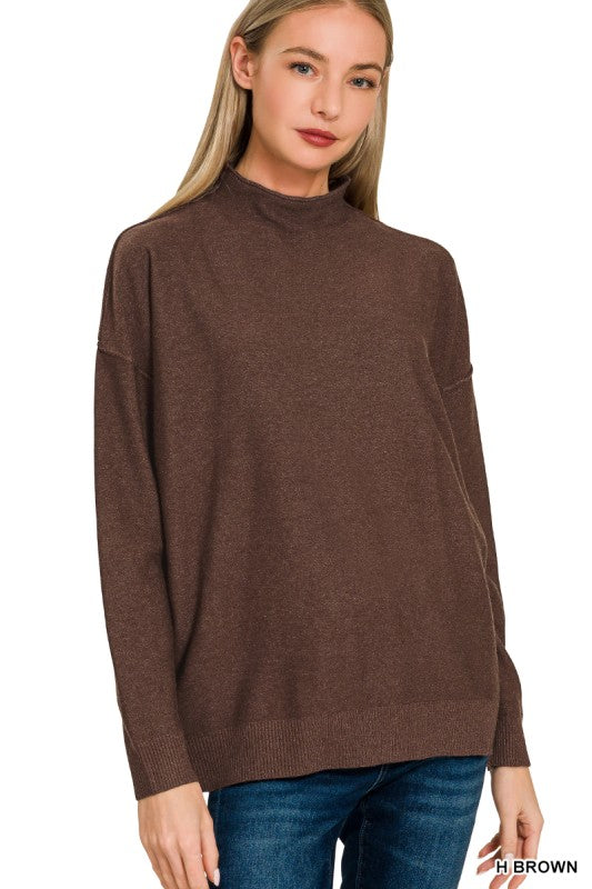 Solid knit pullover top with mock neck, and three quarter bell sleeves.