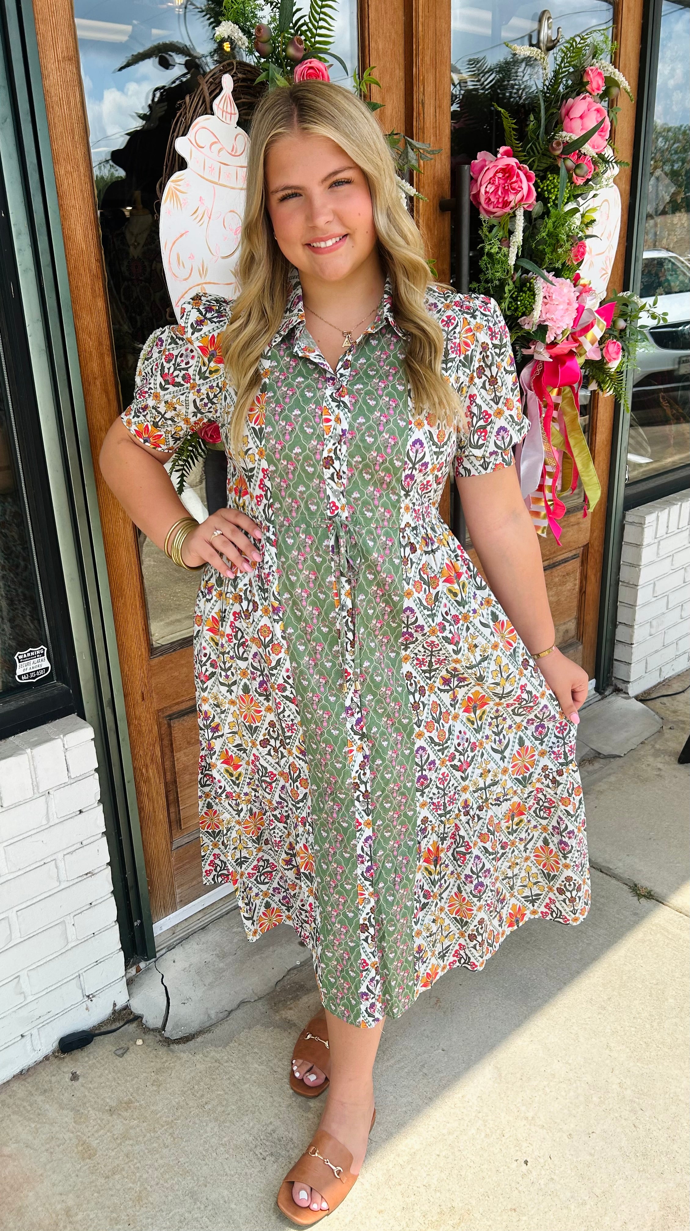 Diamond pattern floral print band cuff midi dress featuring contrast pattern accent front button closure. Adjustable drawstring at waist. Side pockets. Lined. Woven. Non-sheer. Lightweight.