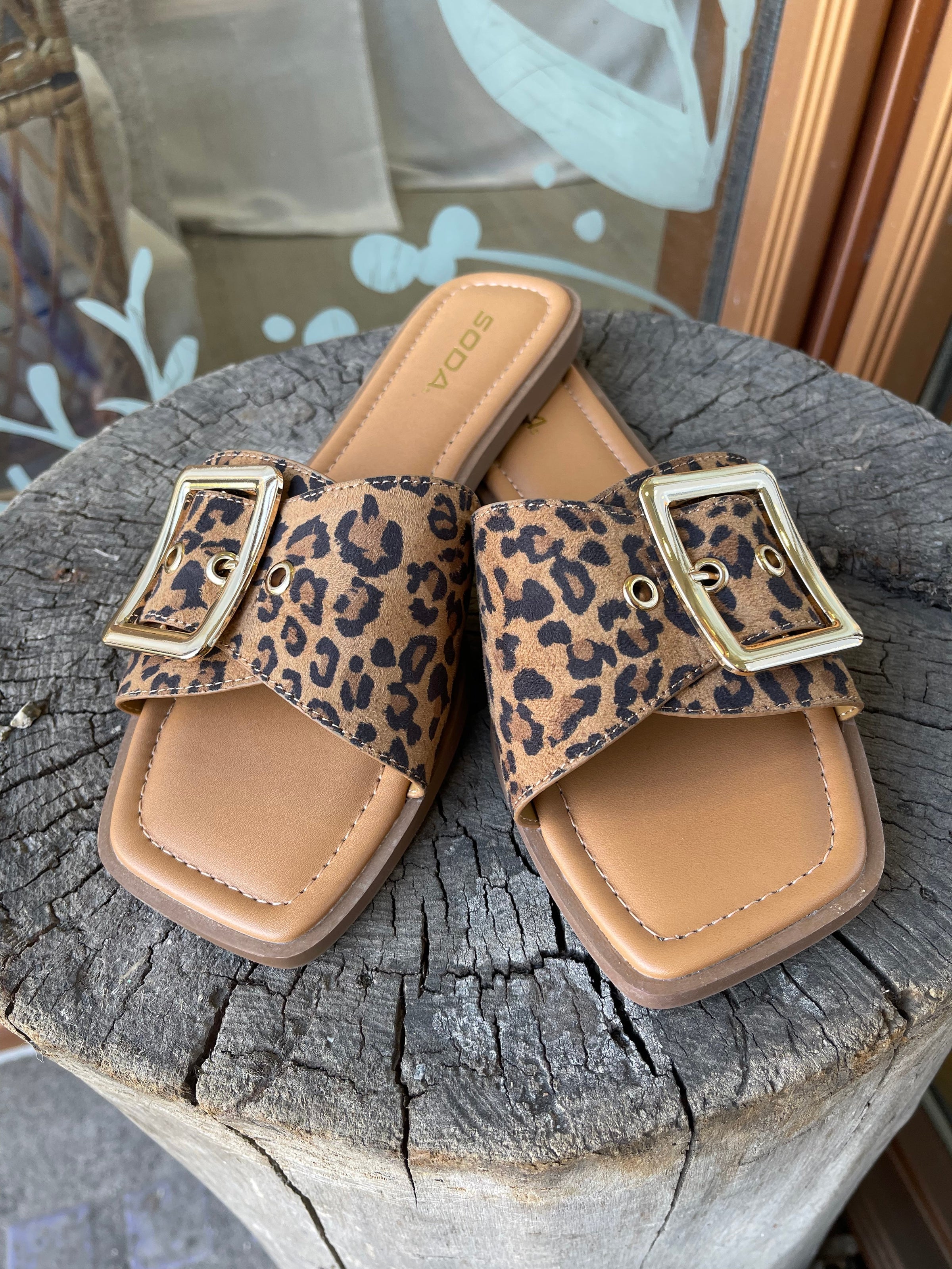 Get ready to pounce on some serious style with our Soda Leopard Opera Leo Sandal! Featuring a fierce leopard print and a glimmering gold buckle, these flats will have you looking and feeling like a wild fashion icon.